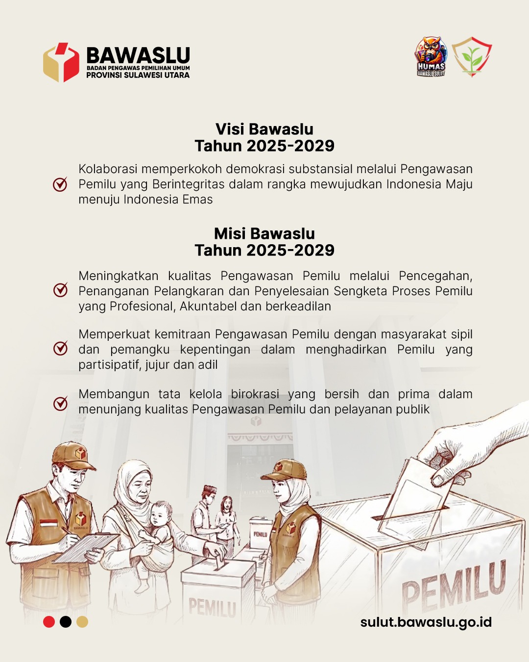 Visi dan Misi Bawaslu 2025-2029 humas | Rabu, Februari 4, 2026 - 08:58 Share Galeri Lainnya Apa saja jenis Informasi Publik sesuai dengan Peraturan Bawaslu Fungsi Pengawasan Pemilu Pelaksanaan Pengawasan Partisipatif Laporan Hasil Pengawasan dan Tindak Lanjut Hasil Pengawasan PDPB Mengenal Lebih Dekat Lembaga Penyelenggara Pemilu di Indonesia Pengawasan Sistem Informasi Data Pemilih Ngabuburit Pengawasan: Penguatan Tata Kelola Kelembagaan Bawaslu di Masa Non Tahapan Jadwal Narasumber Ngabuburit Pengawasan Ngabuburit Pengawasan "Penguatan Spirit Kelembagaan Bawaslu" Bawaslu Tetap Hadir Untuk Demokrasi Diskusi "Bacerita HPS" Batch 1 Visi dan Misi Bawaslu 2025-2029