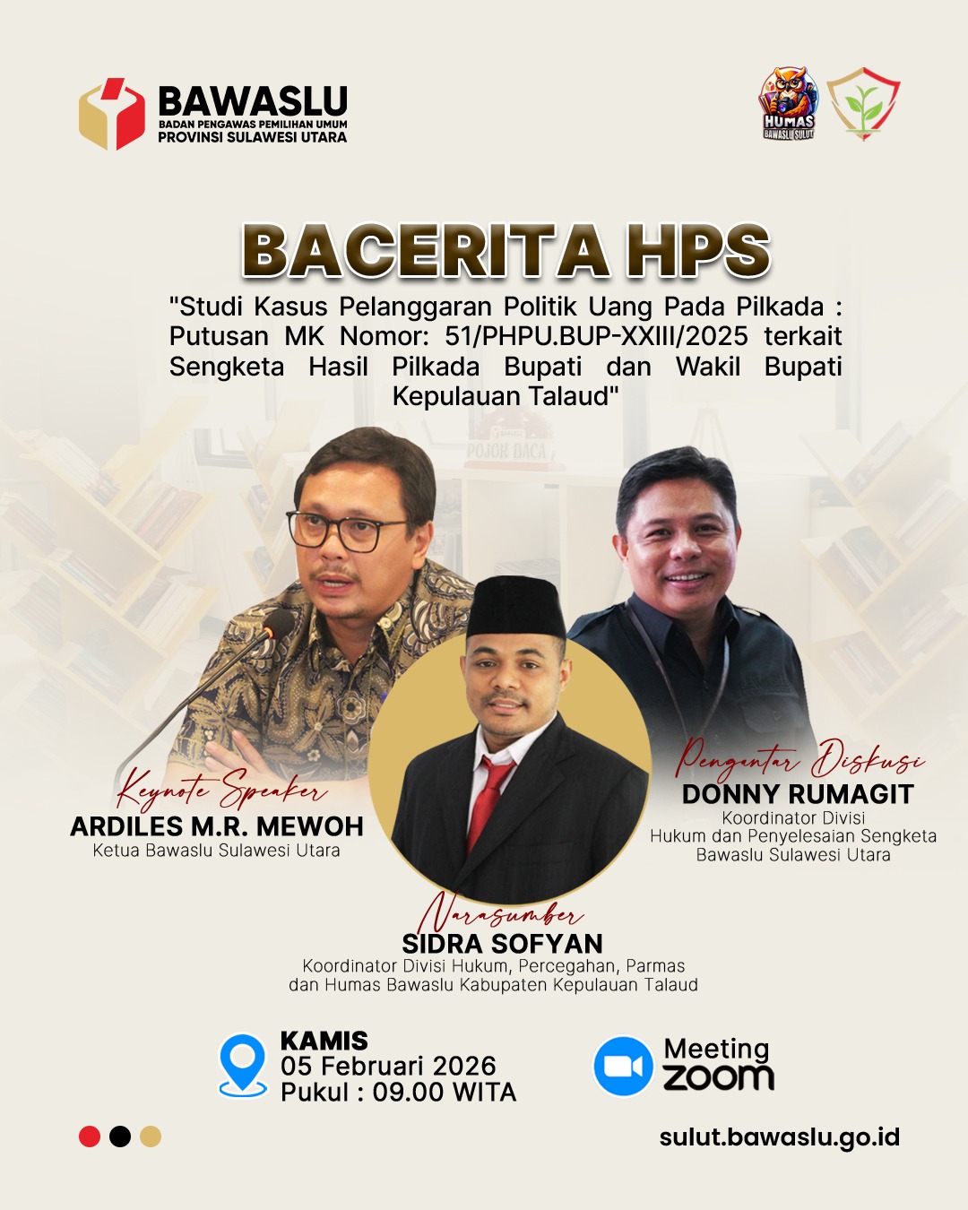 Diskusi "Bacerita HPS" Batch 1 humas | Rabu, Februari 4, 2026 - 09:07 Share Galeri Lainnya Apa saja jenis Informasi Publik sesuai dengan Peraturan Bawaslu Fungsi Pengawasan Pemilu Pelaksanaan Pengawasan Partisipatif Laporan Hasil Pengawasan dan Tindak Lanjut Hasil Pengawasan PDPB Mengenal Lebih Dekat Lembaga Penyelenggara Pemilu di Indonesia Pengawasan Sistem Informasi Data Pemilih Ngabuburit Pengawasan: Penguatan Tata Kelola Kelembagaan Bawaslu di Masa Non Tahapan Jadwal Narasumber Ngabuburit Pengawasan Ngabuburit Pengawasan "Penguatan Spirit Kelembagaan Bawaslu" Bawaslu Tetap Hadir Untuk Demokrasi Diskusi "Bacerita HPS" Batch 1 Visi dan Misi Bawaslu 2025-2029