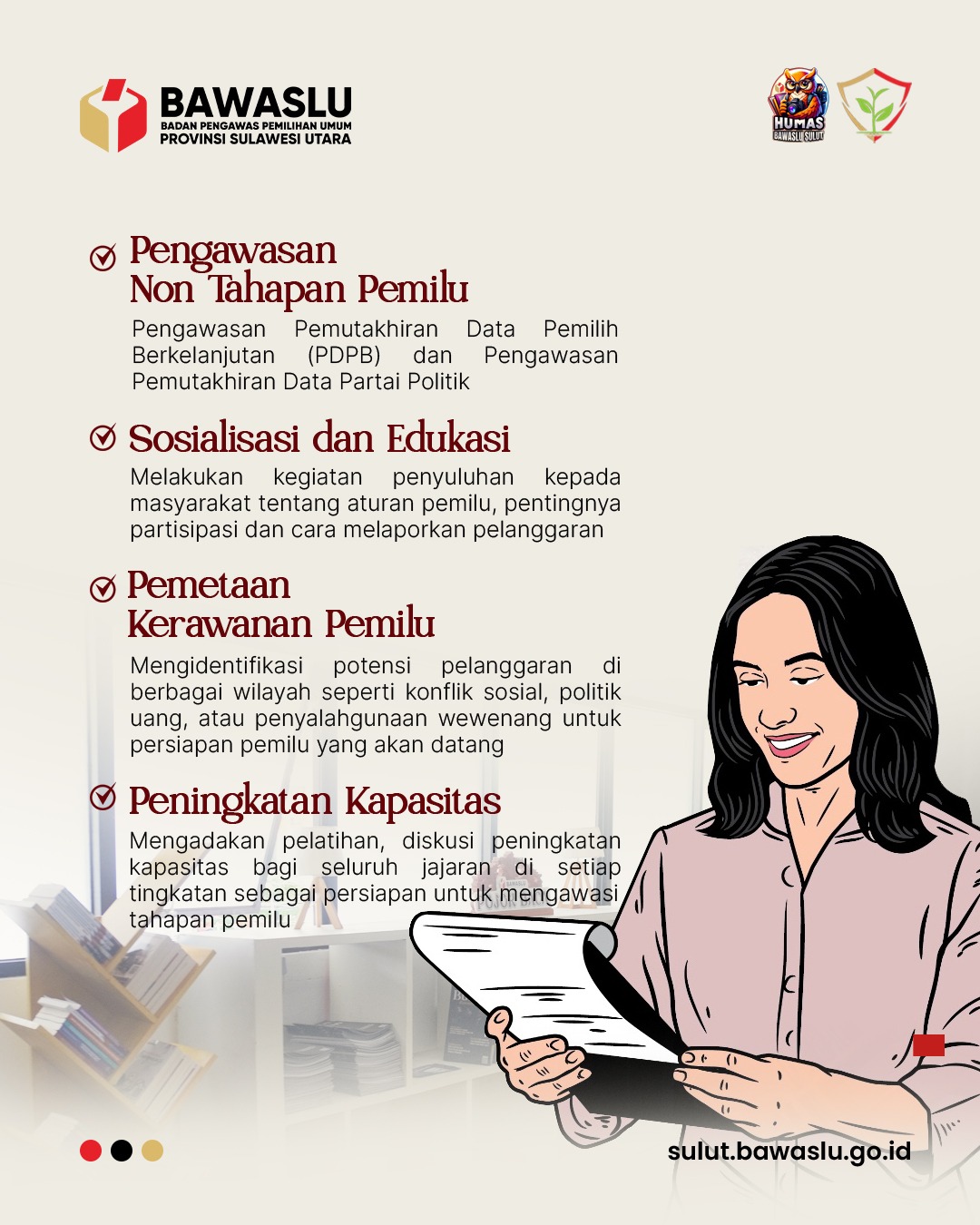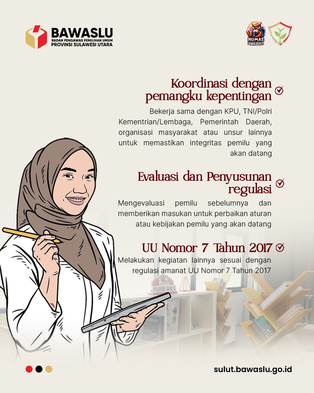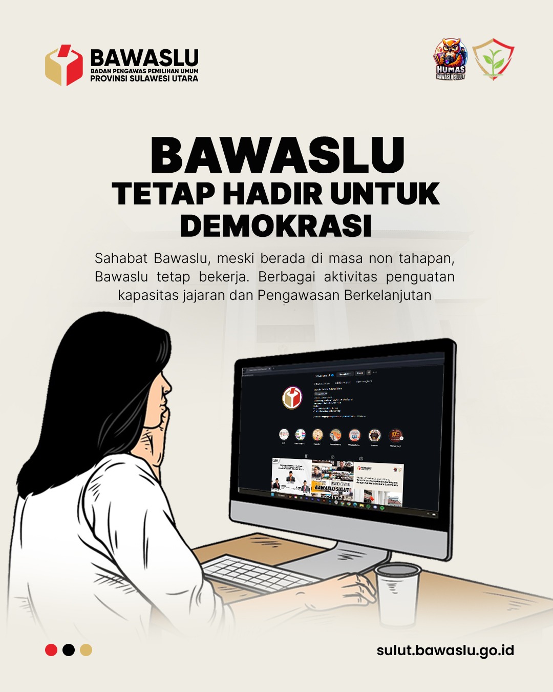 Bawaslu Tetap Hadir Untuk Demokrasi humas | Rabu, Februari 4, 2026 - 09:12 Share Galeri Lainnya Apa saja jenis Informasi Publik sesuai dengan Peraturan Bawaslu Fungsi Pengawasan Pemilu Pelaksanaan Pengawasan Partisipatif Laporan Hasil Pengawasan dan Tindak Lanjut Hasil Pengawasan PDPB Mengenal Lebih Dekat Lembaga Penyelenggara Pemilu di Indonesia Pengawasan Sistem Informasi Data Pemilih Ngabuburit Pengawasan: Penguatan Tata Kelola Kelembagaan Bawaslu di Masa Non Tahapan Jadwal Narasumber Ngabuburit Pengawasan Ngabuburit Pengawasan "Penguatan Spirit Kelembagaan Bawaslu" Bawaslu Tetap Hadir Untuk Demokrasi Diskusi "Bacerita HPS" Batch 1 Visi dan Misi Bawaslu 2025-2029