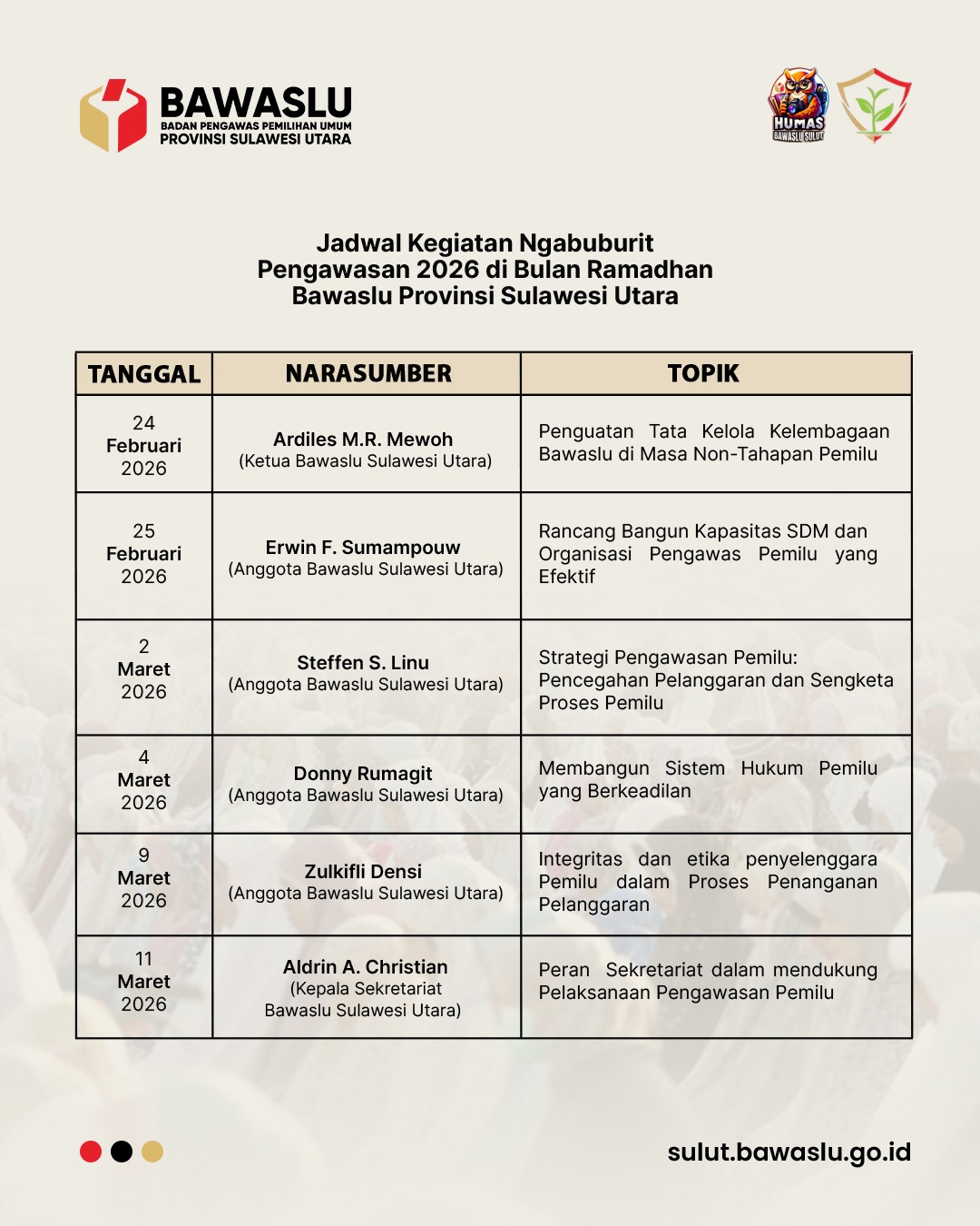 Jadwal Narasumber Ngabuburit Pengawasan humas | Senin, Februari 23, 2026 - 12:53 Share Galeri Lainnya Apa saja jenis Informasi Publik sesuai dengan Peraturan Bawaslu Fungsi Pengawasan Pemilu Pelaksanaan Pengawasan Partisipatif Laporan Hasil Pengawasan dan Tindak Lanjut Hasil Pengawasan PDPB Mengenal Lebih Dekat Lembaga Penyelenggara Pemilu di Indonesia Pengawasan Sistem Informasi Data Pemilih Ngabuburit Pengawasan: Penguatan Tata Kelola Kelembagaan Bawaslu di Masa Non Tahapan Jadwal Narasumber Ngabuburit Pengawasan Ngabuburit Pengawasan "Penguatan Spirit Kelembagaan Bawaslu" Bawaslu Tetap Hadir Untuk Demokrasi Diskusi "Bacerita HPS" Batch 1 Visi dan Misi Bawaslu 2025-2029