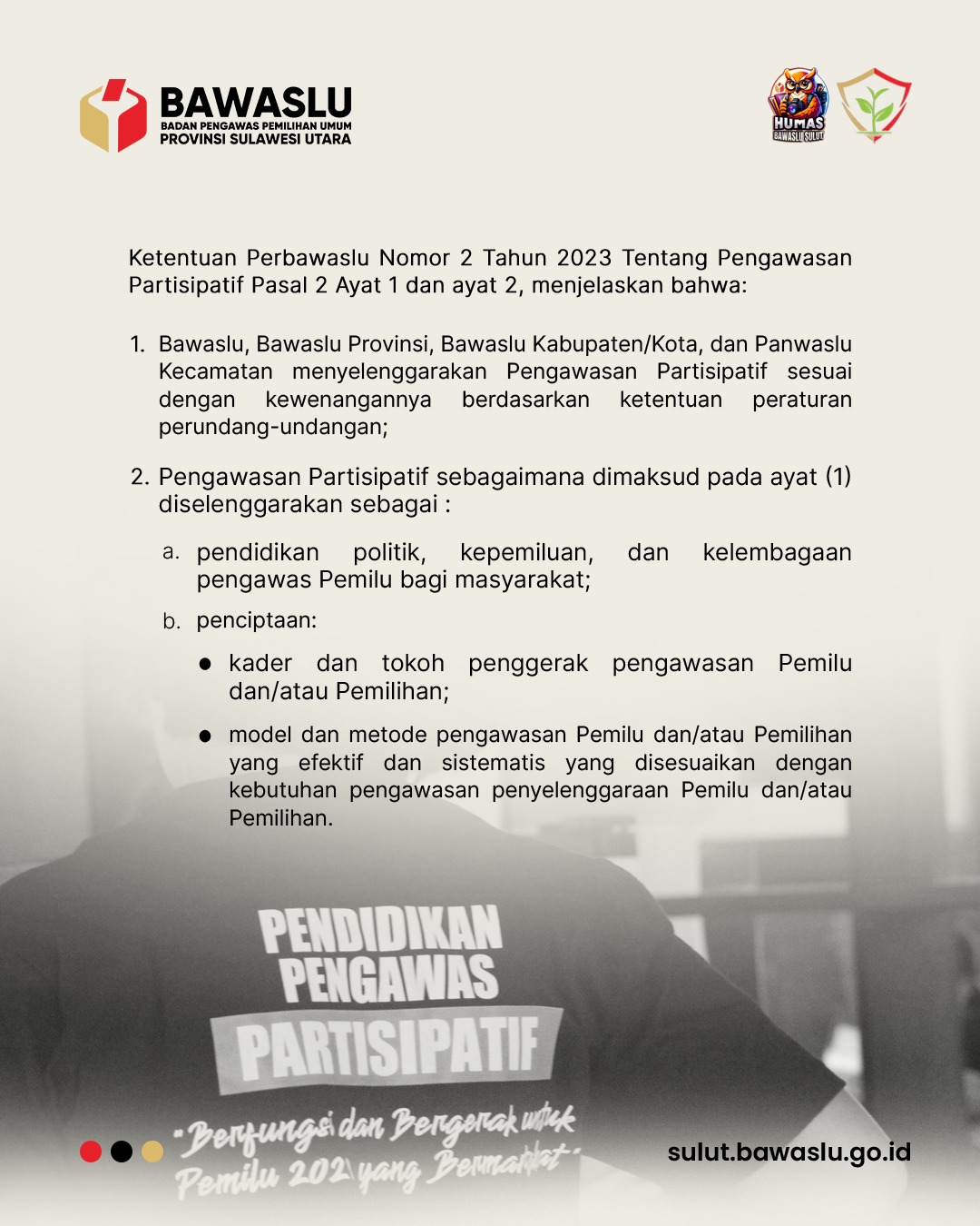 Pelaksanaan Pengawasan Partisipatif humas | Kamis, Maret 5, 2026 - 11:53 Share Galeri Lainnya Apa saja jenis Informasi Publik sesuai dengan Peraturan Bawaslu Fungsi Pengawasan Pemilu Pelaksanaan Pengawasan Partisipatif Laporan Hasil Pengawasan dan Tindak Lanjut Hasil Pengawasan PDPB Mengenal Lebih Dekat Lembaga Penyelenggara Pemilu di Indonesia Pengawasan Sistem Informasi Data Pemilih Ngabuburit Pengawasan: Penguatan Tata Kelola Kelembagaan Bawaslu di Masa Non Tahapan Jadwal Narasumber Ngabuburit Pengawasan Ngabuburit Pengawasan "Penguatan Spirit Kelembagaan Bawaslu" Bawaslu Tetap Hadir Untuk Demokrasi Diskusi "Bacerita HPS" Batch 1 Visi dan Misi Bawaslu 2025-2029